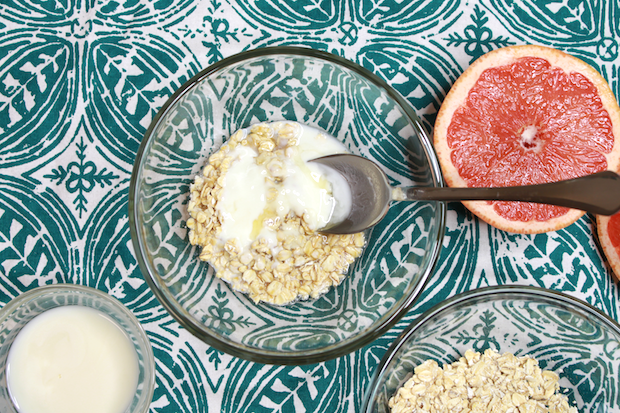 إعصري نصف الجريب فروت في وعاء الخلط وضفي إليه الشوفان واللبن و العسل و خلط جميع المكونات معاً حتي تحصلي علي خليط متسق.
